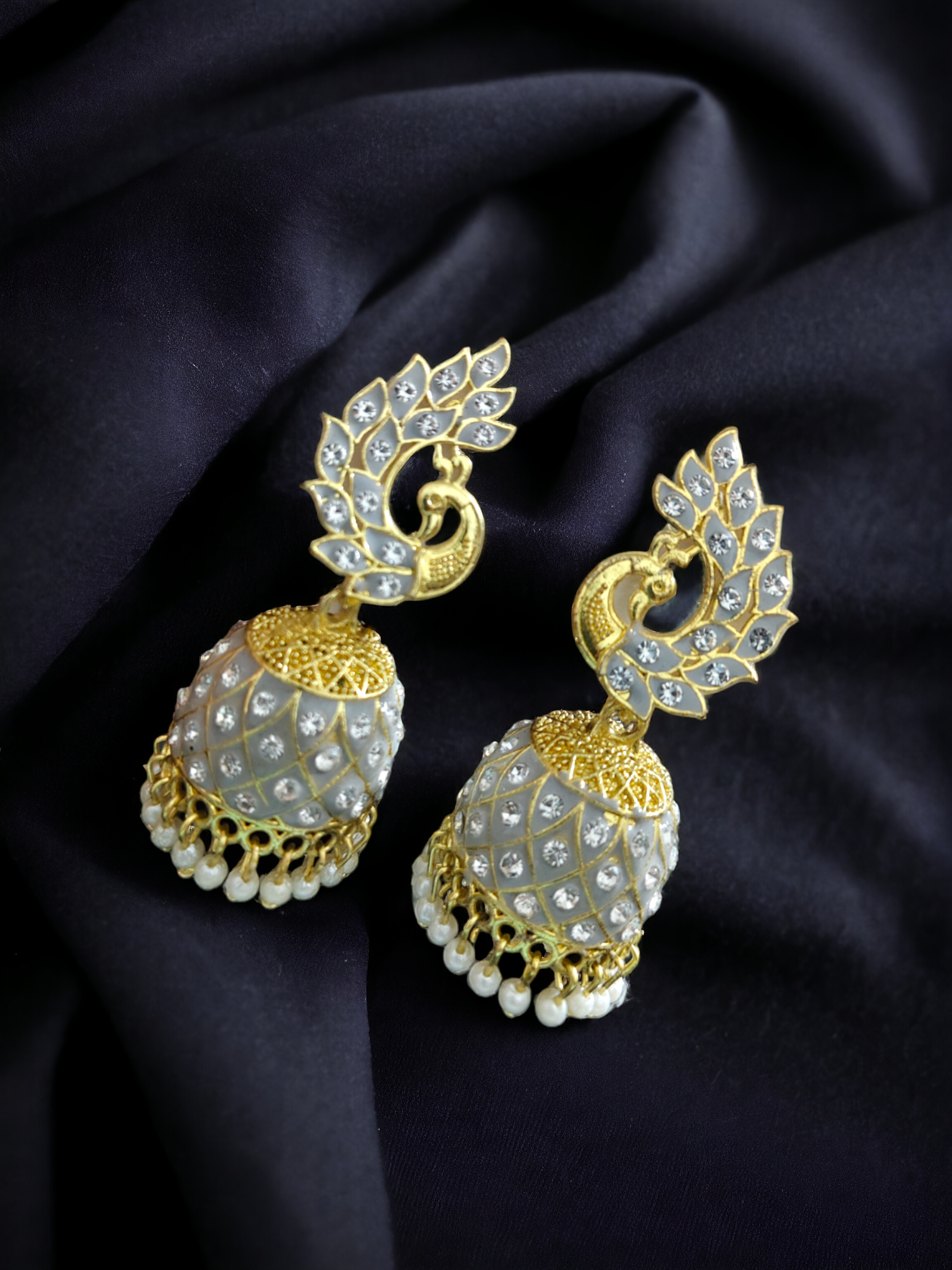 Hand-painted peacock meenakari jhumkis with pearls?festive and graceful.