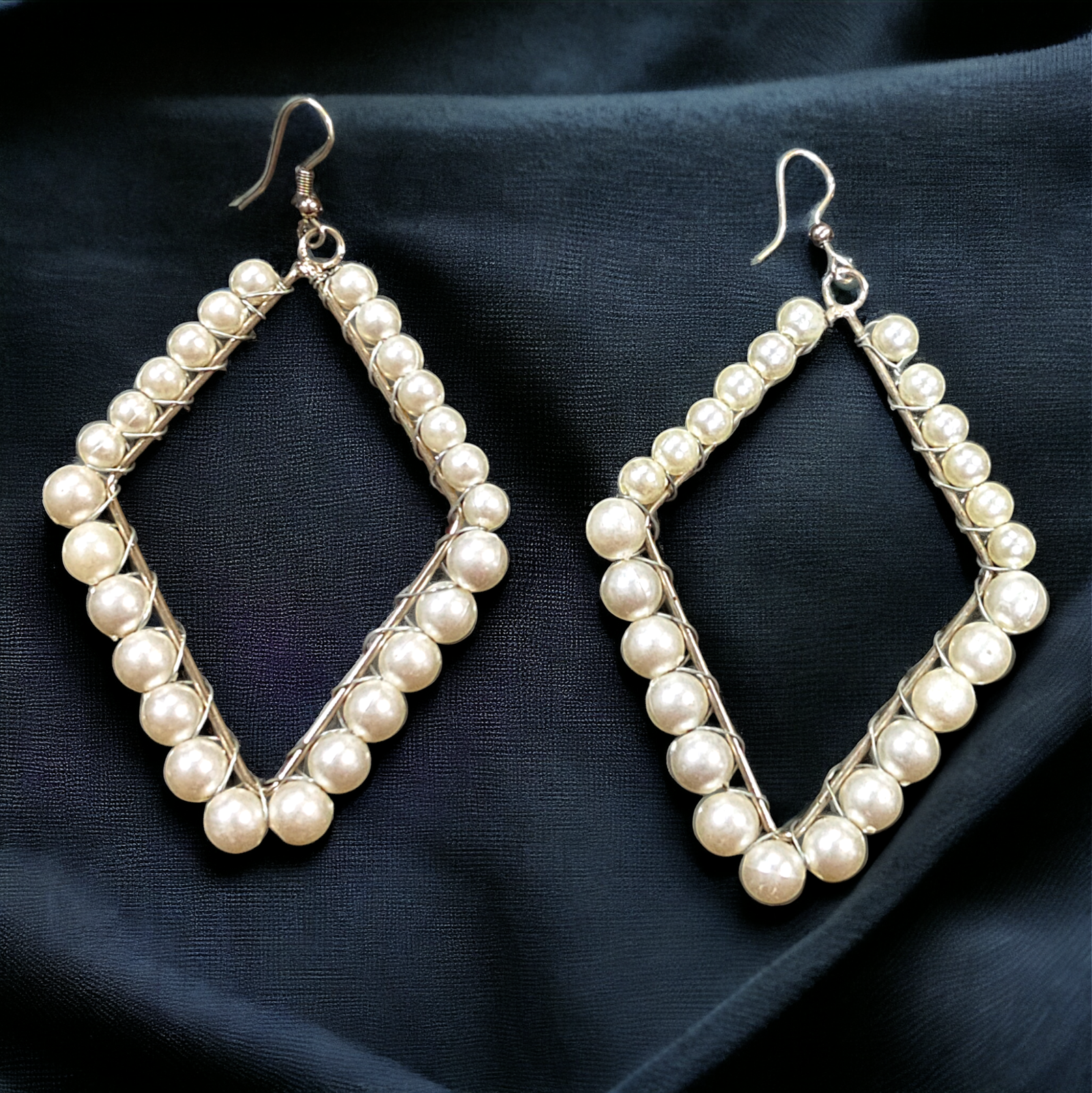 Diamond-shaped hoops with pearls?a fusion of elegance and geometry.